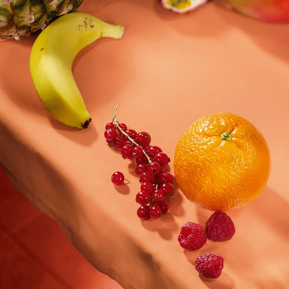 Each flavour’s fruit was photographed on a homely and comforting table top, with the table cloth draping over the corner of the pack.